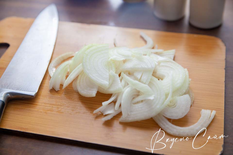 Второй шаг. Крупную луковицу очищаю и нарезаю полукольцами.