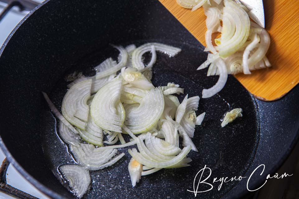 Третий шаг. В хорошо разогретую сковороду с небольшим количеством растительного масла отправляю лук. Лук обжариваю периодически помешивая.
