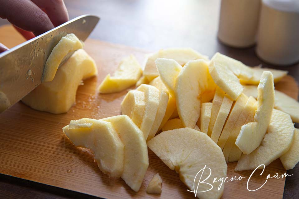 Совет: отдайте свое предпочтение кисло-сладким яблокам и нарезайте их толщиной по 0,5 мм.