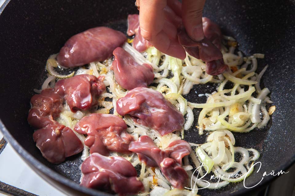 Пятый шаг. Когда лук немного подрумянится выкладываю в сковороду одним слоем куриную печень.