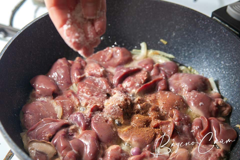 Шестой шаг. Куриную печень солю и перчу по своему вкусу. Обжариваю печень по 3-4 минуты с каждой стороны.